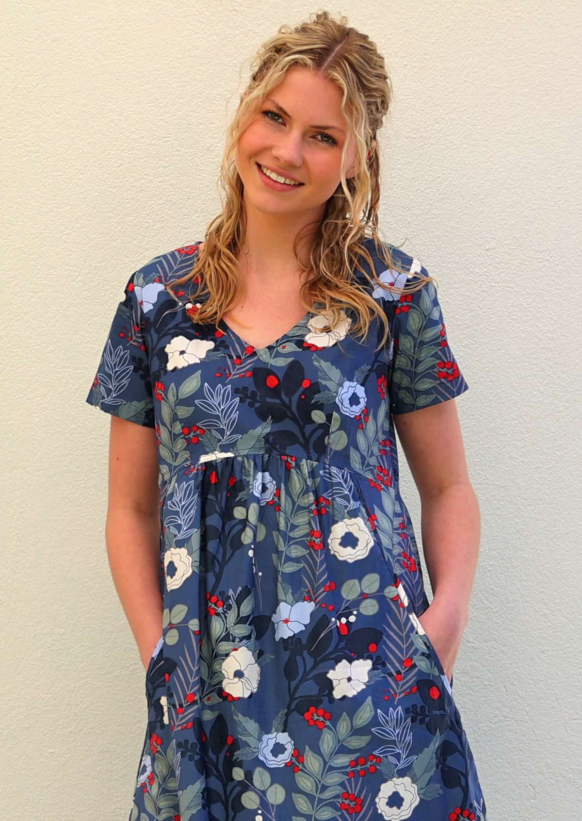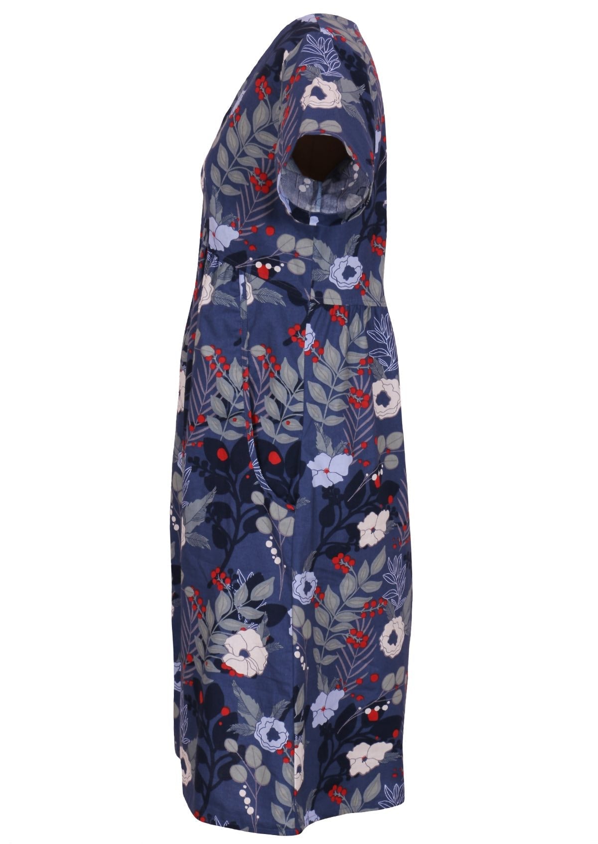 A gyönyörű Etta ruha 100% pamutból készült, merész Gardenia kék mintázattal és szürkéskék alapon piros foltokkal. Ez a sokoldalú és kényelmes pamutruha tökéletes bármilyen alkalomra, V-nyakú és empire derekú kialakításának köszönhetően minden alakhoz illik. A praktikus zsebek praktikussá teszik a mindennapi viseletet. Cipzár nélkül egyszerűen felhúzható és indulhat is. Viselheti lapos vagy magas sarkú cipővel, leggingsszel , csizmával és kordbársony kabáttal pedig stílusos megjelenést kölcsönözhet hűvösebb időben.
