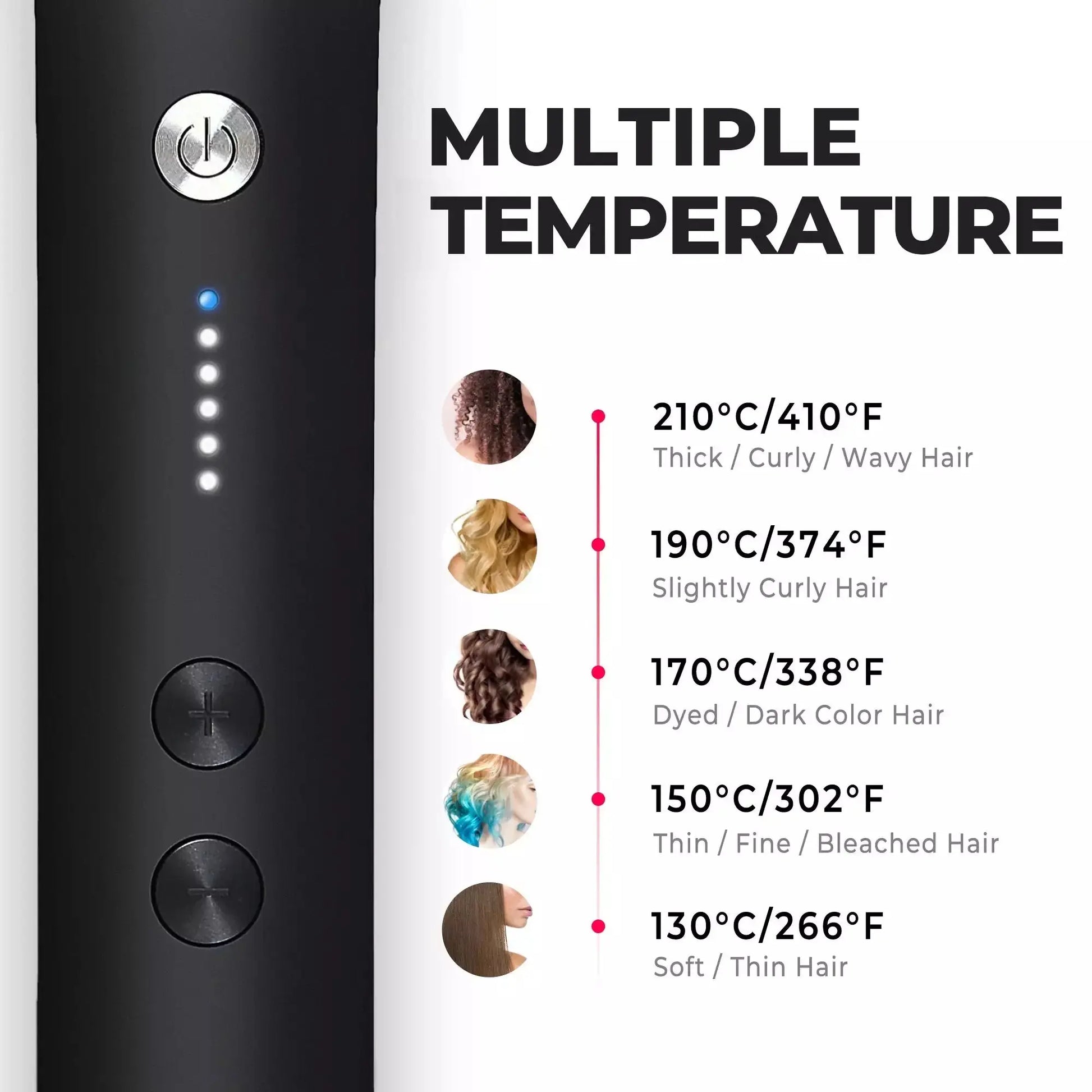 5 hőmérsékleti szint a különböző hajtípusokhoz (266℉-410℉).