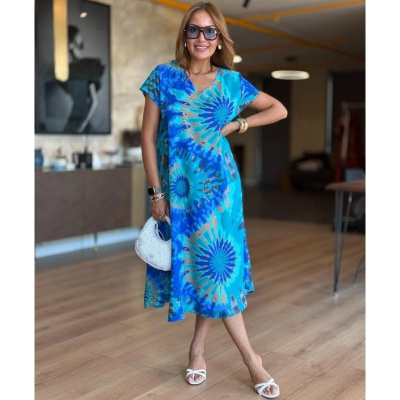 🌸 Női lezser mintás maxi ruhák V-nyakkal