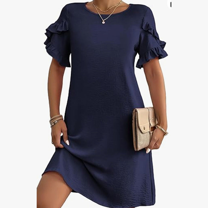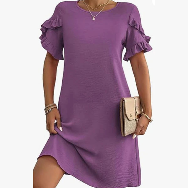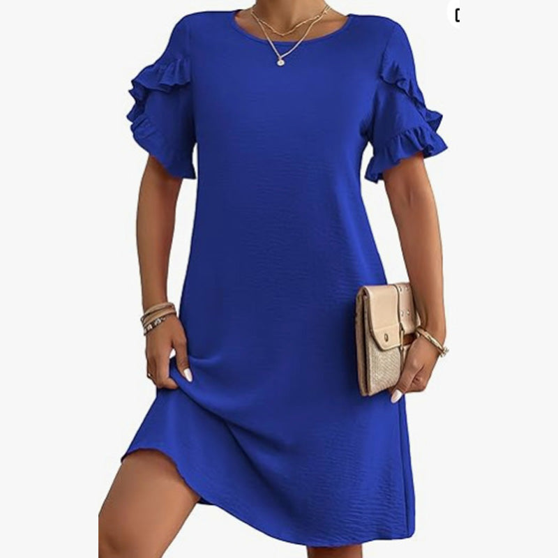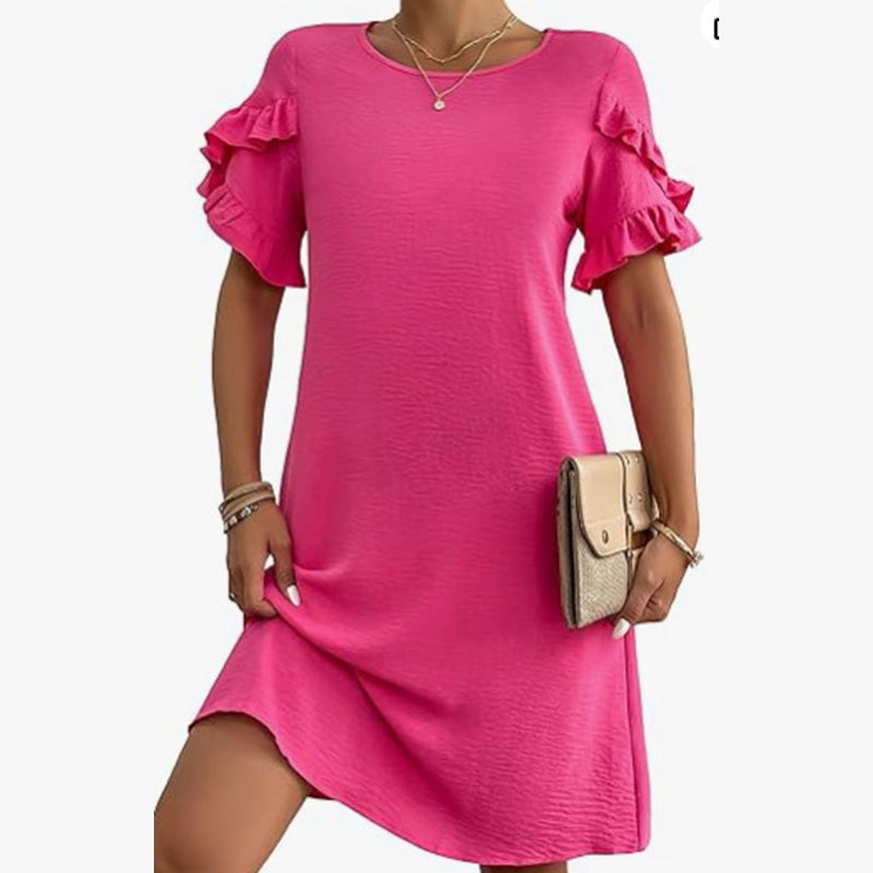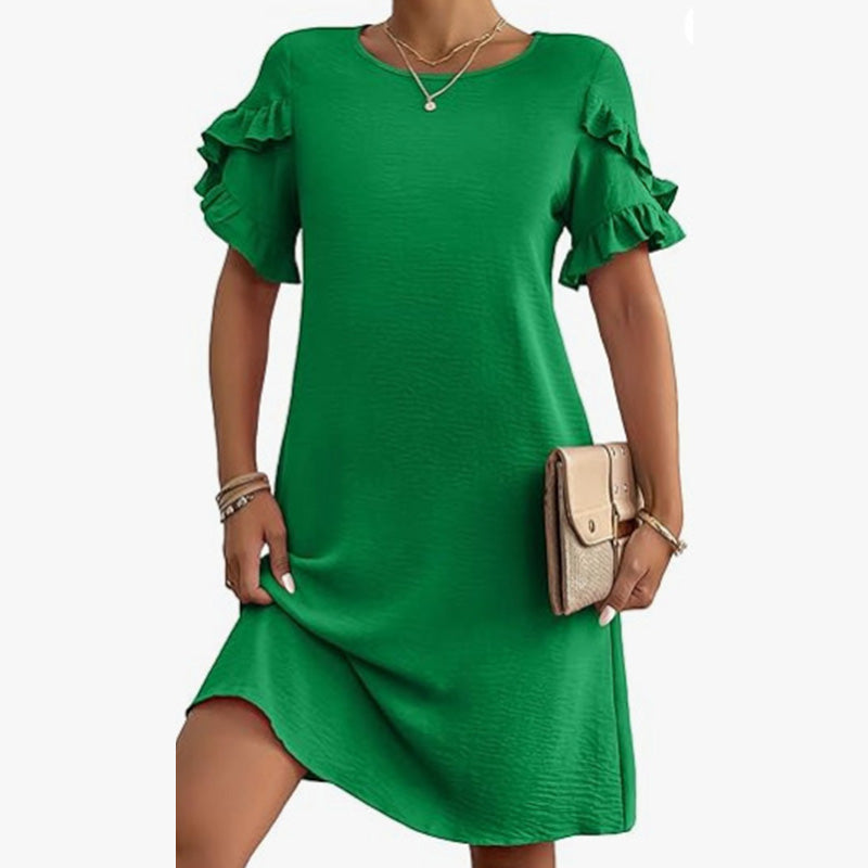 Női egyszínű A-vonalú, fodros, rövid ujjú ruha