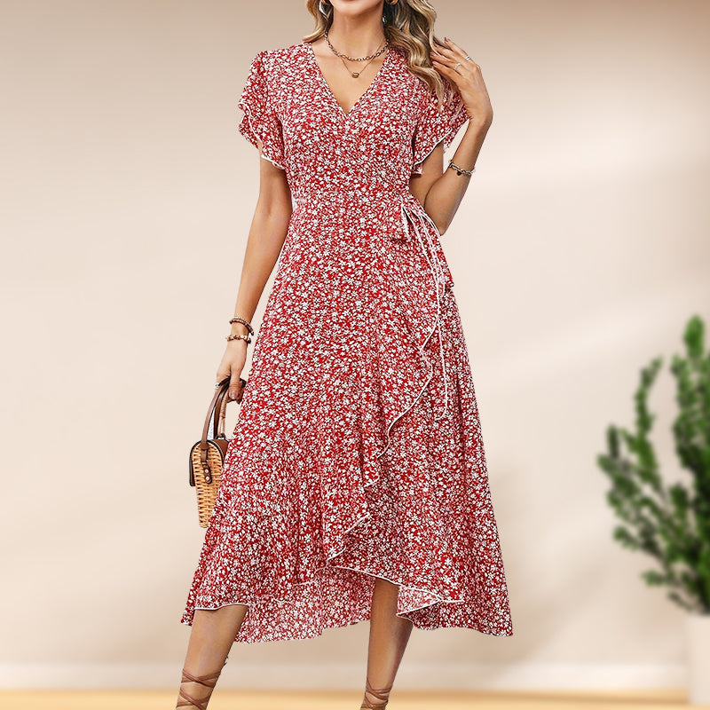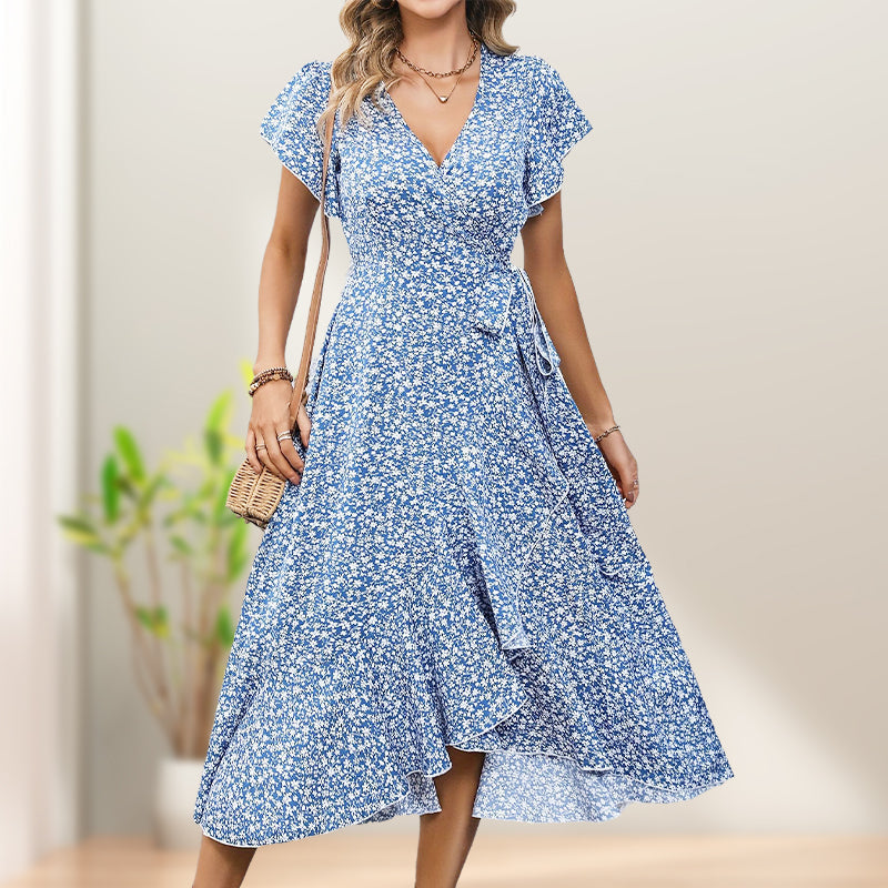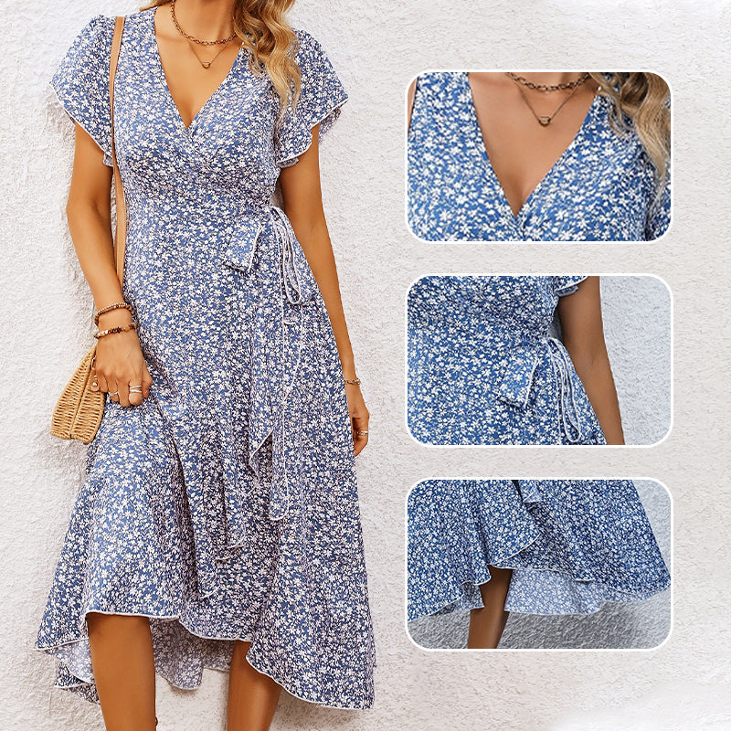 Női nyári elegáns virágos ruha derékban megkötős, V-nyakkal