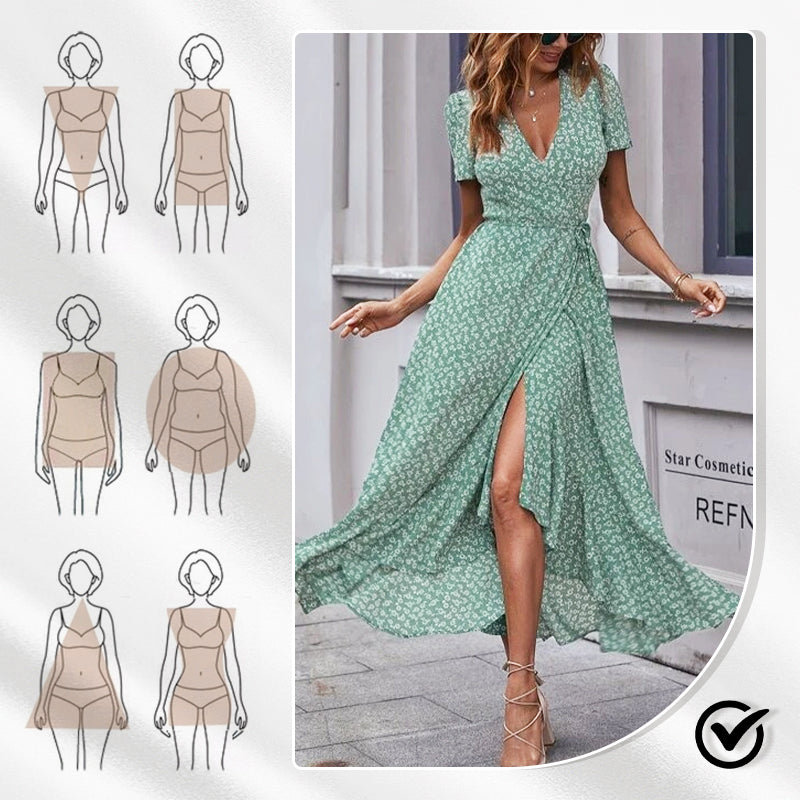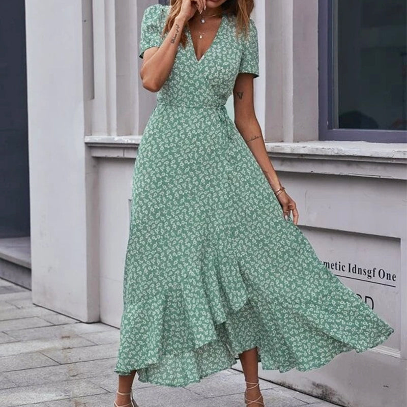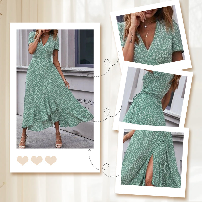 BOTANIKAI DESIGN BUJA SZÍNEKKEL – Vonja fel magára a figyelmet a zöld hangulat, finom virágmotívumokkal díszítve, amelyet egy hízelgő V-nyakkendő és keskeny derék keretez. Ez a maxi ruha ötvözi a romantikát a formával, tökéletes kerti partikhoz, villásreggelihez vagy esti sétákhoz, ahol a természet ihlette elegancia kerül a középpontba.